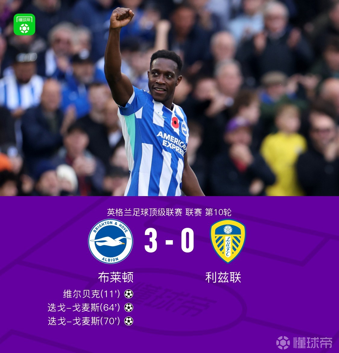 布莱顿3-0利兹联,维尔贝克破门,迭戈-戈麦斯梅开二度